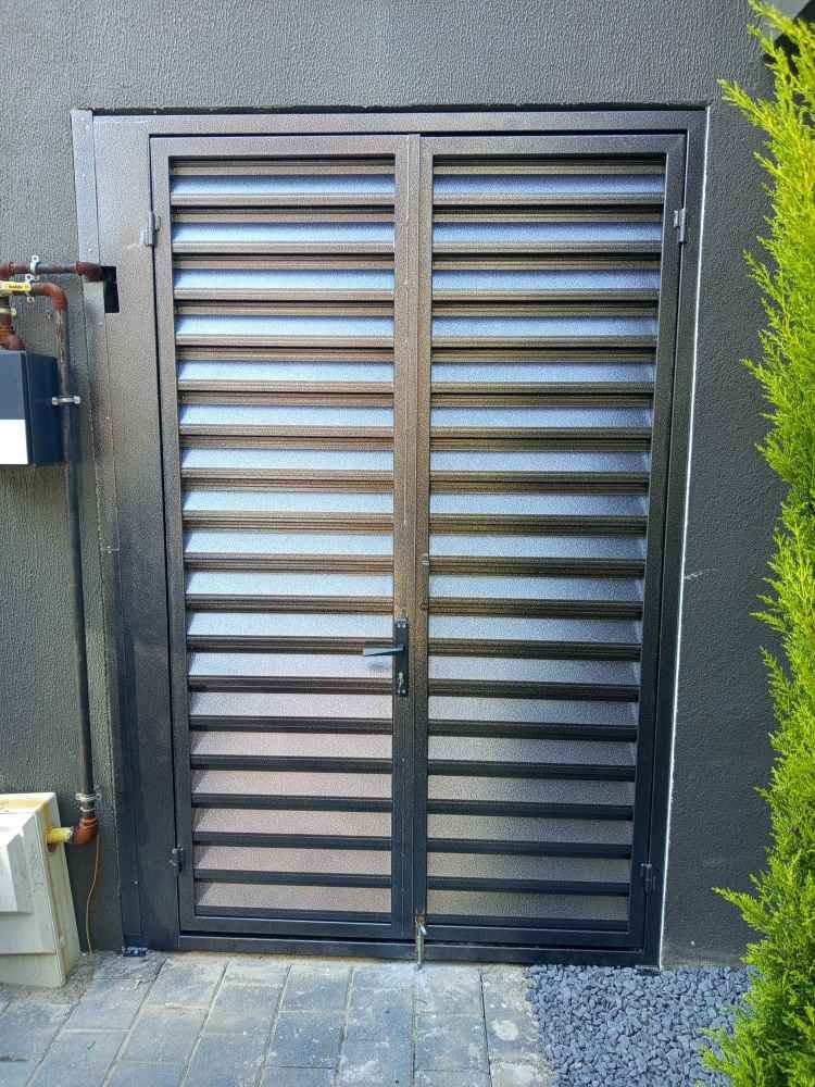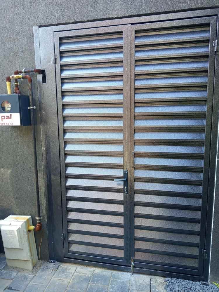 Çift kanatlı kapı tasarımı sayesinde geniş açıklıklarda kolay kullanım ve servis erişimi sağlar. Panjur formu hava sirkülasyonunu engellemeden ekipmanların güneş, toz ve dış etkenlerden korunmasına yardımcı olur.